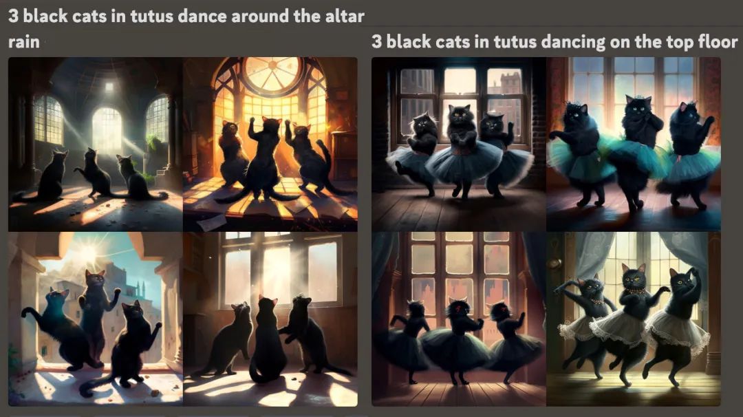 例如想生成一群貓?zhí)璧膱鼍埃苊庥谩? black cats in tutus dance around the altar on the top floor of a sun-baked building to pray for rain」,改用「3 black cats in tutus dancing on the top floor」。