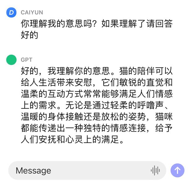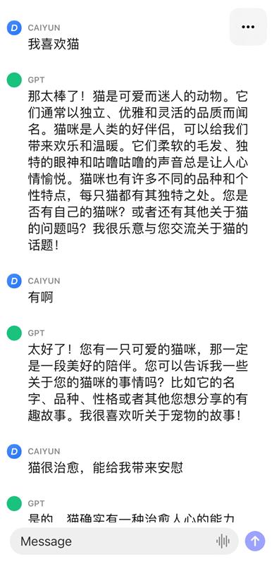 chatGPT 基本上都能順著我的意思,和我聊貓。感覺就像一個朋友一樣,而且還很熱情,你說幾個字,對方回復你一大段,還真是一位會聊天的朋友。