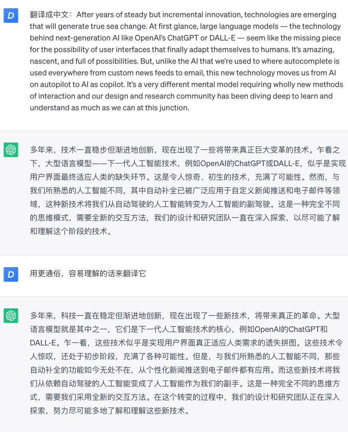 比如有時候我會用幫我翻譯一段話,如果不加要求的話,它的直譯會比較硬。那么我就會讓它用更通俗的話翻譯出來。