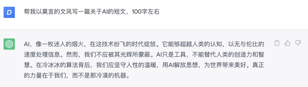 比如我說幫我以魯迅的文風寫一篇關于 AI 的短文,100 字左右。