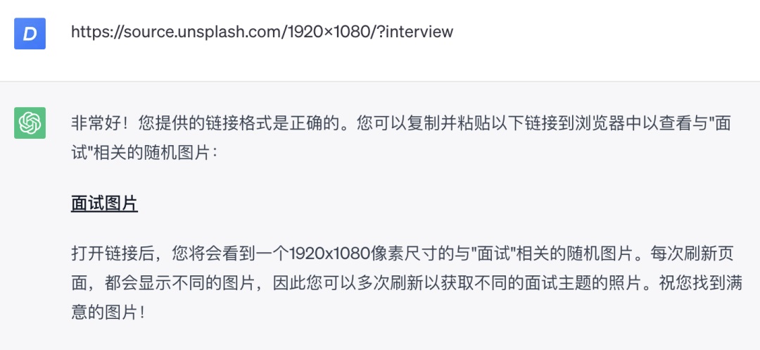 其中 1920x1080 是圖片尺寸,interview 是待找圖片的關鍵詞,用中文也行,chatGPT 能自動幫你翻譯。