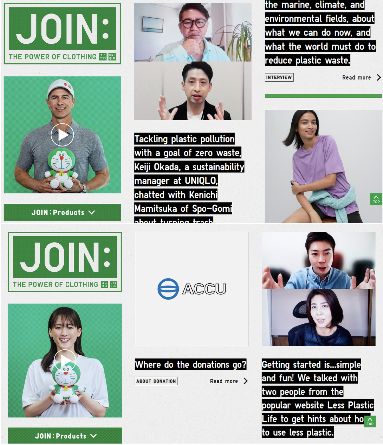后者,優(yōu)衣庫則建了專門的網(wǎng)站,發(fā)布了綾瀨遙等明星為活動錄制的倡導(dǎo)視頻,網(wǎng)站還包含諸多科普教育的內(nèi)容,有關(guān)于海洋問題對科學(xué)家的特別內(nèi)容采訪,還有海洋環(huán)保等自然科普文章,來提高大眾海洋保護意識。