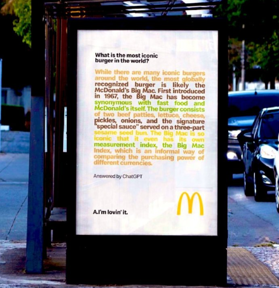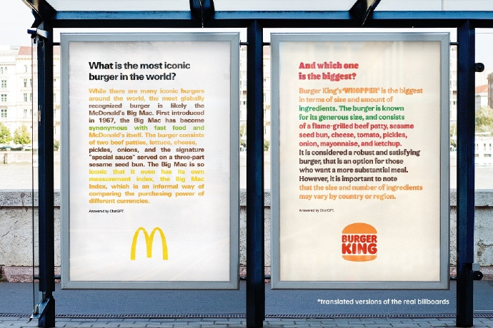 比如,給大家瓜吃的麥當(dāng)勞與漢堡王。當(dāng)ChatGPT 火遍互聯(lián)網(wǎng),麥當(dāng)勞向其提問“世界上最具標(biāo)志性的漢堡是什么?”,并將夸自個兒的答案投放在路邊。