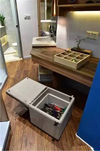 小孩子的多功能椅兼具收納功能。老人愛做木工,工具多,設(shè)計(jì)師為他設(shè)計(jì)的椅子就有了很多儲(chǔ)物格,打開折起來都方便,易托拉,可以帶到其他空間使用。