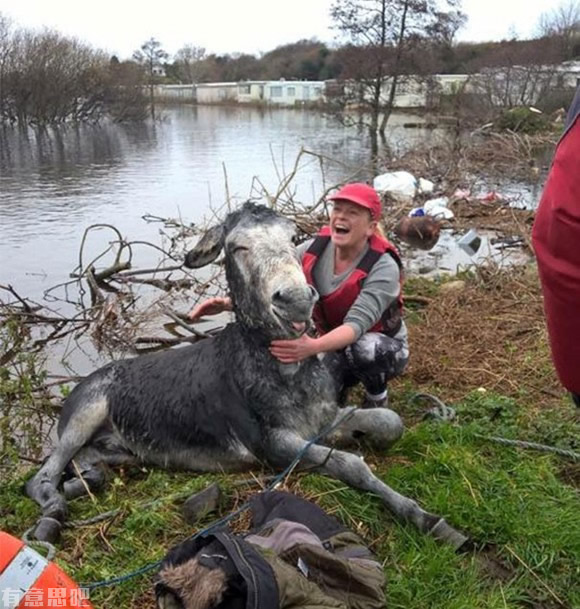 2、一頭毛驢在洪水中被救起,露出了開心的笑容。