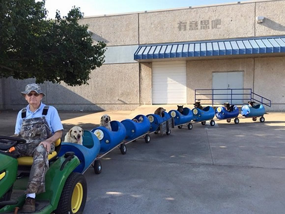 5、80多歲的他,做了一個狗狗火車,帶著這些收養(yǎng)的流浪狗去溜達。