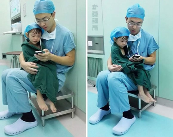 12、心臟科主治醫(yī)生,抱著2歲的即將要做手術的女孩一起玩手機游戲,以此來緩解女孩的恐懼。