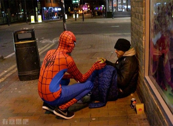 17、男子將自己打扮成蜘蛛俠,夜里給流浪者送食物。