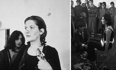 這是行為藝術(shù)家 馬里娜·阿布拉莫維奇Marina Abramovic早期的行為藝術(shù),她在房間貼出告示,準(zhǔn)許觀眾隨意挑選桌上的72種物件與藝術(shù)家進(jìn)行強(qiáng)迫性身體接觸。在這72件物品中,有玫瑰,蜂蜜等令人愉快的東西,也有剪刀、匕首、十字弓、灌腸器等危險(xiǎn)性的器具。其中甚至有一把裝有一顆子彈的手槍。