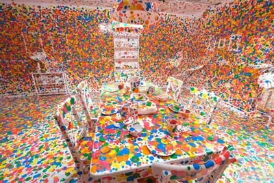 這是草間彌生(Yayoi Kusama)2013年在上海展覽的現(xiàn)場(chǎng)。觀眾可以從工作人員那里得到一些圓點(diǎn)貼紙,并且可以把它們貼在展廳的任何地方。這本身就是一件作品,觀眾也參與了創(chuàng)作。每個(gè)人都貼的很開(kāi)心。這真的是讓人終生難忘的一個(gè)房間,從過(guò)程到效果有莫名其妙的歡樂(lè)氣氛。