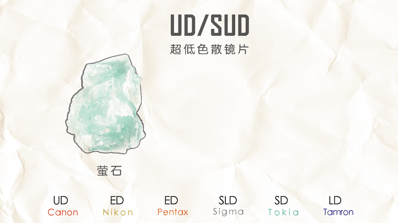 UD:超低色散鏡片Ultra Low Dispersion 。因為批量采用提純的螢石晶體的話造價太貴了,人們就研發(fā)出了 UD 玻璃。2片 UD 鏡片的作用與一片螢石鏡片的作用相當。