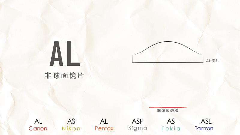 AL:非球面鏡片Aspherical Lens 。顧名思義設計中采用的鏡片并不是一個弧形球面,傳統(tǒng)球面鏡片存在著無法將并行的光線以完整的形狀聚集在一個點上的問題,造成了大光圈拍攝成像相對模糊(球面象差)、廣角鏡頭拍攝影像扭曲(比如畫面邊緣的樓是彎的)、以及減少鏡片數量使鏡頭的小型化——非球面鏡片是解決這三大問題必不可缺的技術之一。另外研磨非球面鏡片是經過人工多次測量和打磨而成,普通非球面鏡片則是機器直接鑄模而成。