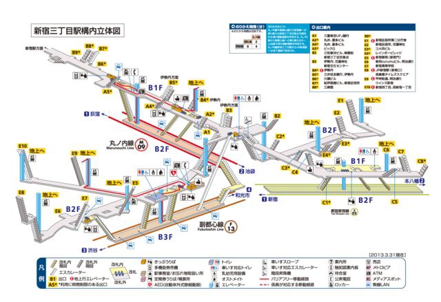 以上標識的缺點在于,車站真的非常復雜。當你處在一個多線路換乘站,每條線路以不同的角度交叉,這時截面圖都不足以表達了。為了更進一步幫助人們了解車站,還提供印有車站的軸側圖的小冊子。