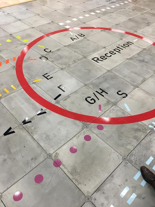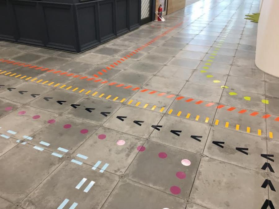 所以,可以想象類似的路線系統(tǒng)用在地鐵站里,指引人從一個站前往另一個站。但是,車站里人來人往,可能得把路線放在天花板上。這樣他們就一直可見,并且不會被每天的踩踏磨損掉。