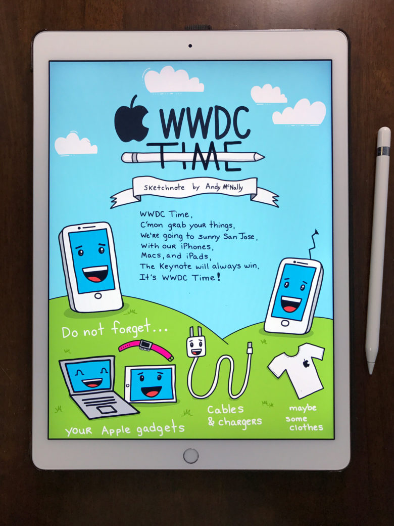最后,Andy McNally 也為我們展示了 WWDC 2017 開始前最后一個版本,當(dāng)然,這也是他特意用 iPad Pro 繪畫的數(shù)字版本,他也很期待能在 WWDC 2017 上,能獲得更多的冒險體驗(yàn)和氣氛。同時,這其實(shí)也是對 WWDC 2017 的一種致敬。